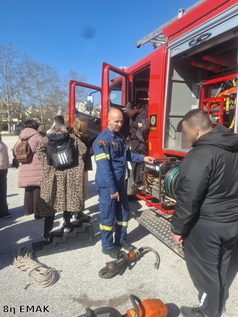 Την Τετάρτη 11 Μαρτίου 2026 στους χώρους του 3ου ΕΚ Λάρισας, το σχολείο επισκέφθηκε κλιμάκιο της 8ης ΕΜΑΚ. Η επίσκεψη πραγματοποιήθηκε στο πλαίσιο του εργαστηριακού μαθήματος «Πρώτες Βοήθειες», με στόχο τη σύνδεση της θεωρητικής γνώσης με την πρακτική εφαρμογή σε πραγματικές συνθήκες έκτακτης ανάγκης. Τα στελέχη της μονάδας Δημοσθένης Ζαχαρός και Αθανάσιος Πιάχας παρουσίασαν στους μαθητές το ειδικό επιχειρησιακό όχημα της ΕΜΑΚ, καθώς και τον εξειδικευμένο εξοπλισμό που χρησιμοποιείται σε επιχειρήσεις διάσωσης και σε περιπτώσεις φυσικών καταστροφών. Παράλληλα, ενημέρωσαν τους μαθητές για τον τρόπο δράσης της μονάδας σε καταστάσεις έκτακτης ανάγκης και για τις απαιτήσεις των αποστολών διάσωσης. Οι μαθητές παρακολούθησαν την παρουσίαση με ιδιαίτερο ενδιαφέρον και είχαν την ευκαιρία να δουν από κοντά τον εξοπλισμό και να συνομιλήσουν με τα στελέχη της μονάδας, θέτοντας ερωτήσεις σχετικά με το έργο και την αποστολή της. Η δράση υλοποιήθηκε από τις εκπαιδευτικούς Γαύρου Βασιλική, Μπακρατσά Καλλιόπη, Παραπανήσιου Ευθυμία, Πήτα Μελπομένη και Ψωφάκη Ευαγγελία.